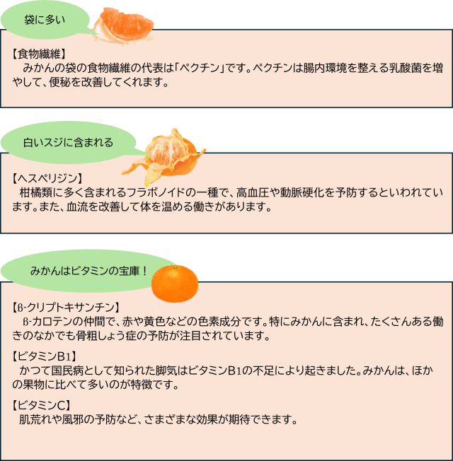 確かに、みかんの袋や白いスジは口当たりが悪く、捨ててしまいがちですが、体にいい栄養がいろいろ含まれています。できるだけ、食べるようにしましょう。