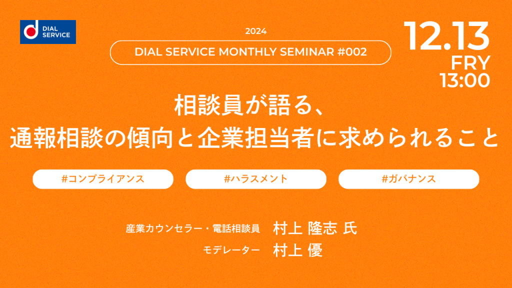 このたびダイヤル・サービスでは、外部通報・相談窓口の基本的な仕組みから最新の法令対応まで、日頃の疑問を解消できるセミナーを開催いたします。
